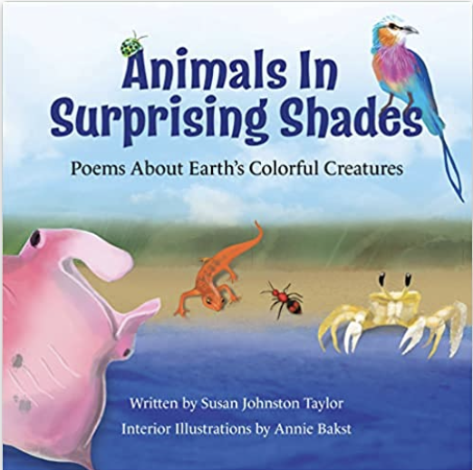 One of their first releases is a gorgeous book of poems about animals in their surprising, unique colors called ANIMALS IN SURPRISING SHADES. And my featured guest for today, Susan Johnston Taylor, wrote all of the words in this remarkable book, illustrated by Annie Bakst! School Library Journal gave it a thumbs-up, saying – “A STEAM-themed poetry collection that should have broad appeal for young readers and will be a welcome addition to the shelves.