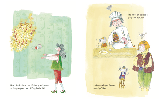 LM: Over the years, I have received feedback on this, and each person helped me to shape it into what it is today. One of the most important comments I received on this was to condense the characters to only the Queen, Tailor and Cook, and Mama and Bebe Mouse as you see them today. Originally, there were more palace workers who were not enthralled with Henri, but I pared them down to the ones who provided food, shelter and clothing. And at the start, I had a Papa Mouse, a Mama Mouse and Bebe Mouse. We always hesitate to get rid of beloved characters, but this really helped streamline the story.