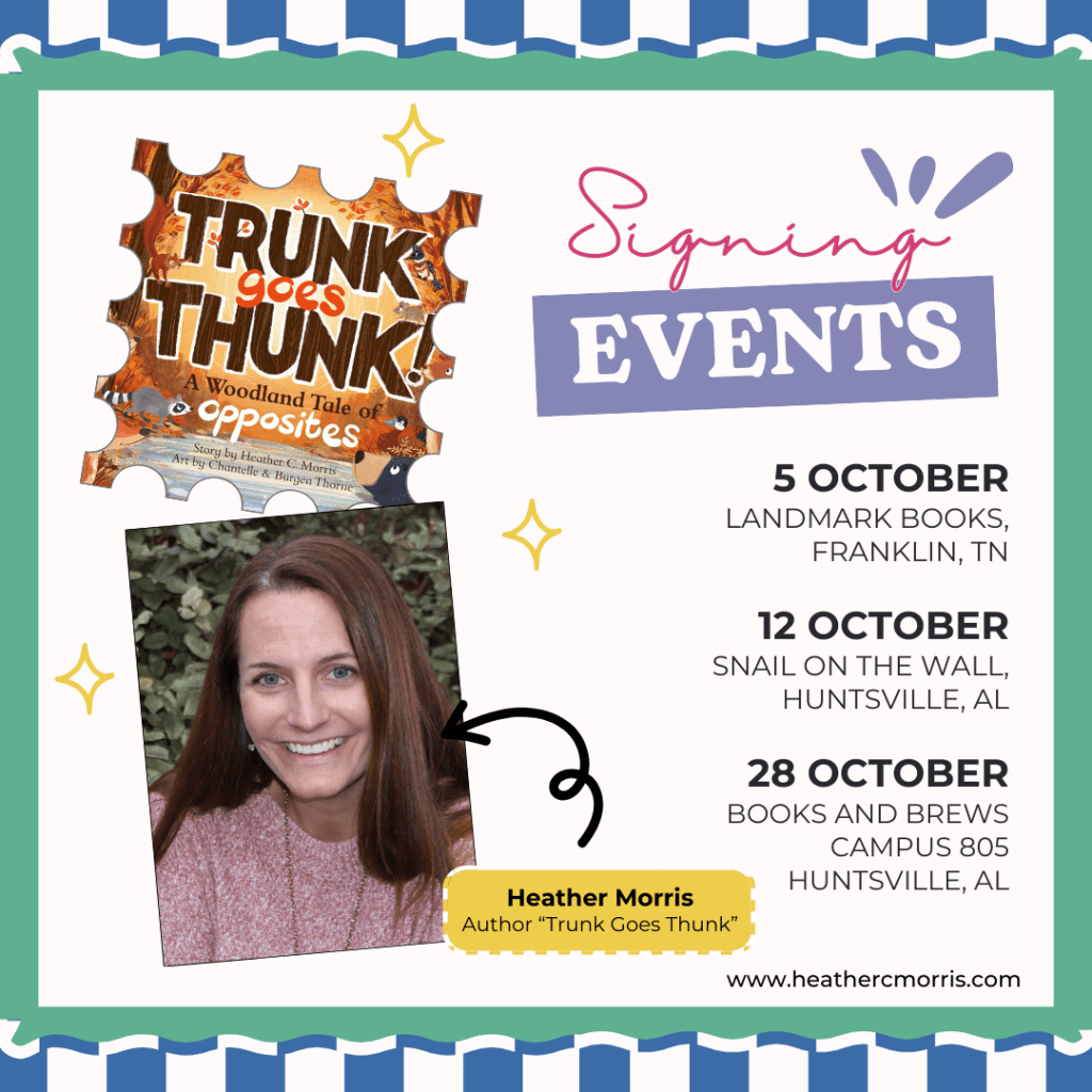 My debut picture book, Trunk Goes Thunk! A Woodland Tale of Opposites, officially releases on October 8!! But there have been some “early sightings” – at the Mississippi Book Festival in Jackson and at the grand opening of my local indie bookstore’s brick and mortar store this past weekend!